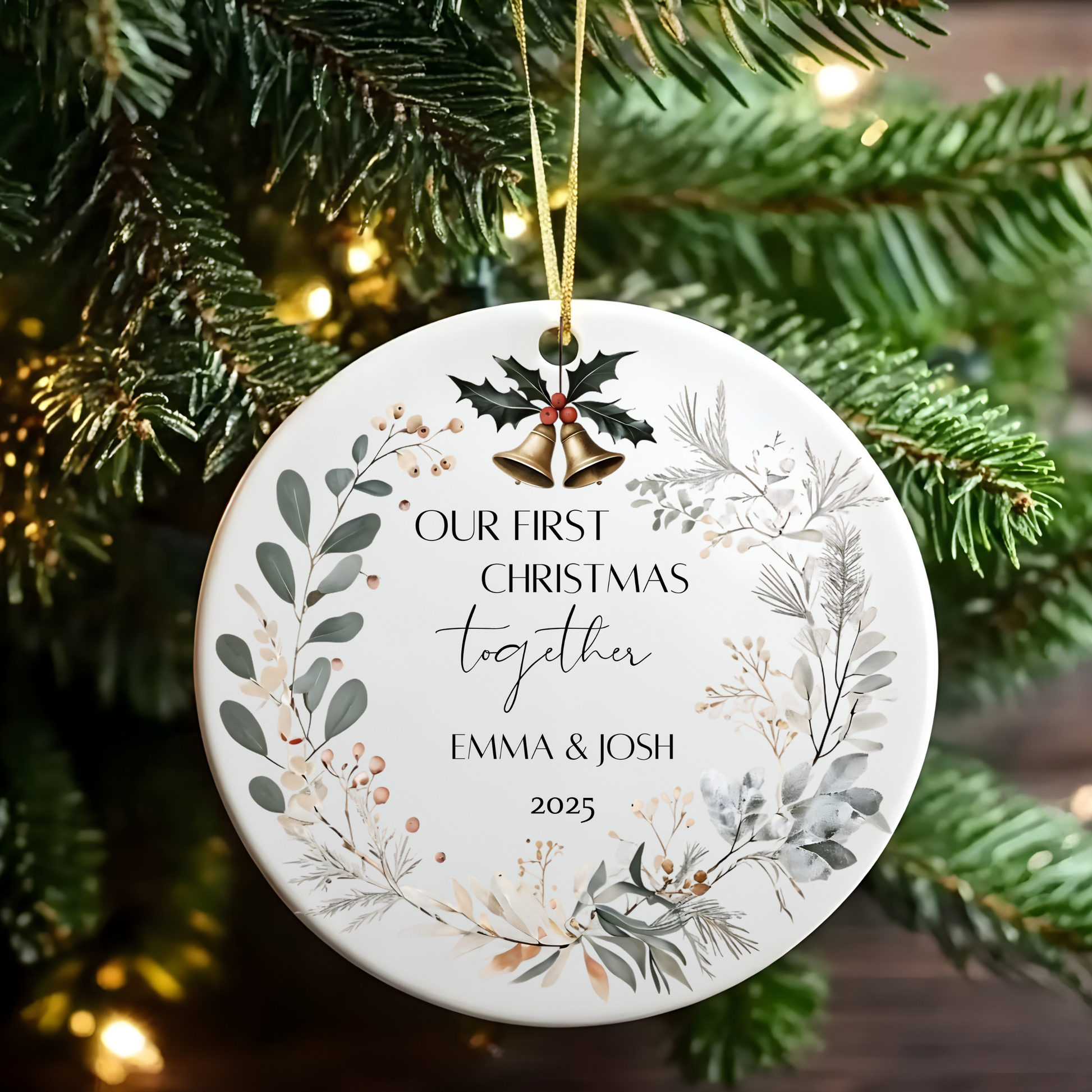 - We automatically include the current year and the text " OUR FIRST CHRISTMAS TOGETHER". If you would like an alternative year or alternative text, please leave a note along with the name. We'll do the rest! Please put Names, year and it will be professionally printed onto the decoration, along with the featured image.